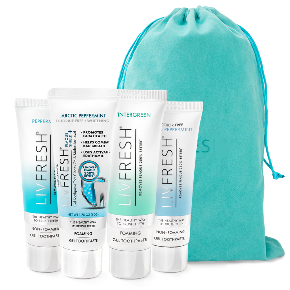 LIVFRESH Gel Toothpaste Variety Pack: Wintergreen Foaming + Arctic Peppermint Foaming + Peppermint Non-Foaming + Mild Peppermint Non-Foaming + Velvet Gift Bag